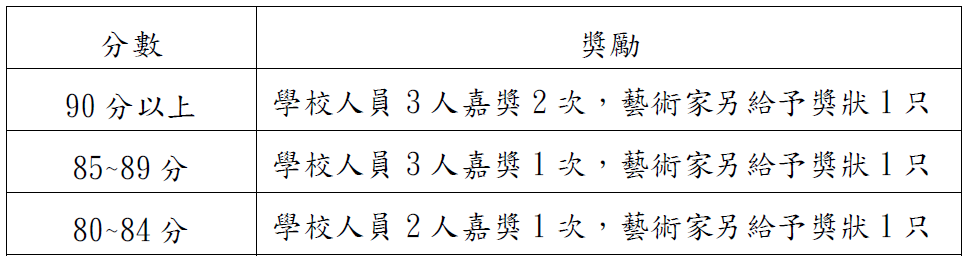 二、訪視委員評分分數送交本縣藝術與美感深耕推動委員會討論,並依據「臺東縣政府所屬各級學校教育專業人員獎懲作業規定」給予受訪學校獎勵。