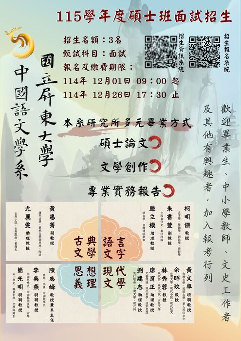 【招生公告-轉知】國立屏東大學中國語文學系115學年度碩士班招生