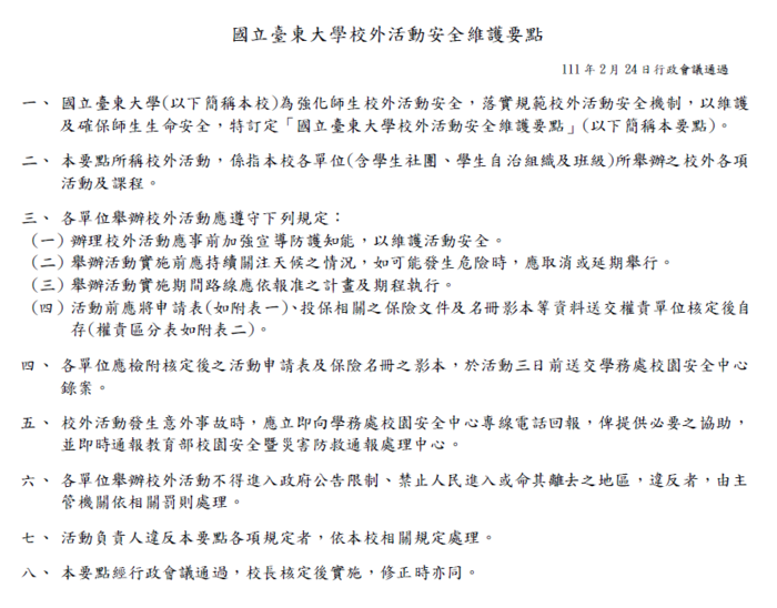 「國立臺東大學校外活動安全維護要點」已經定案,請老師們在校外教學活動三日前務必繳交「校外活動申請表」(如附件),感謝配合!