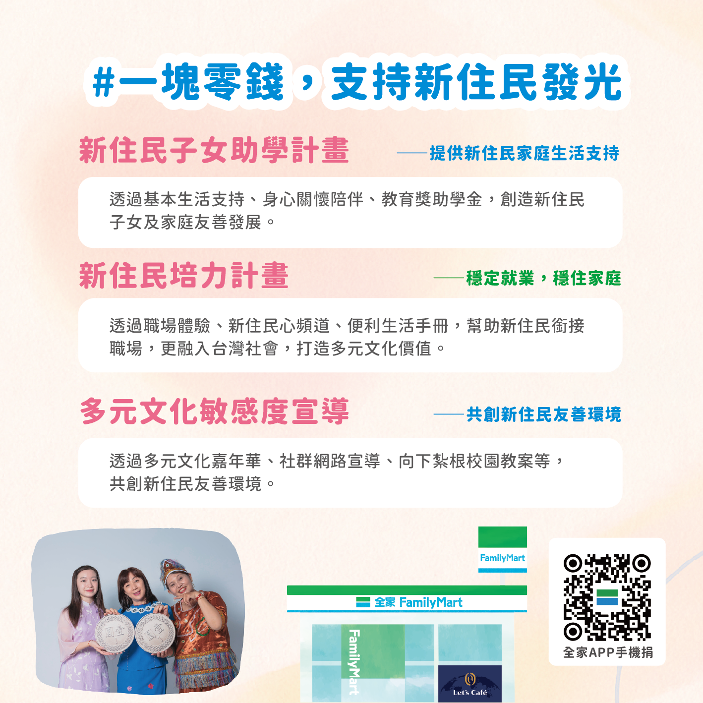 透過全台 4,300 間門市櫃檯零錢捐、FamiPort 與 APP 捐款,號召大家以日常小額善款,支持全台 1,000 戶新住民家庭