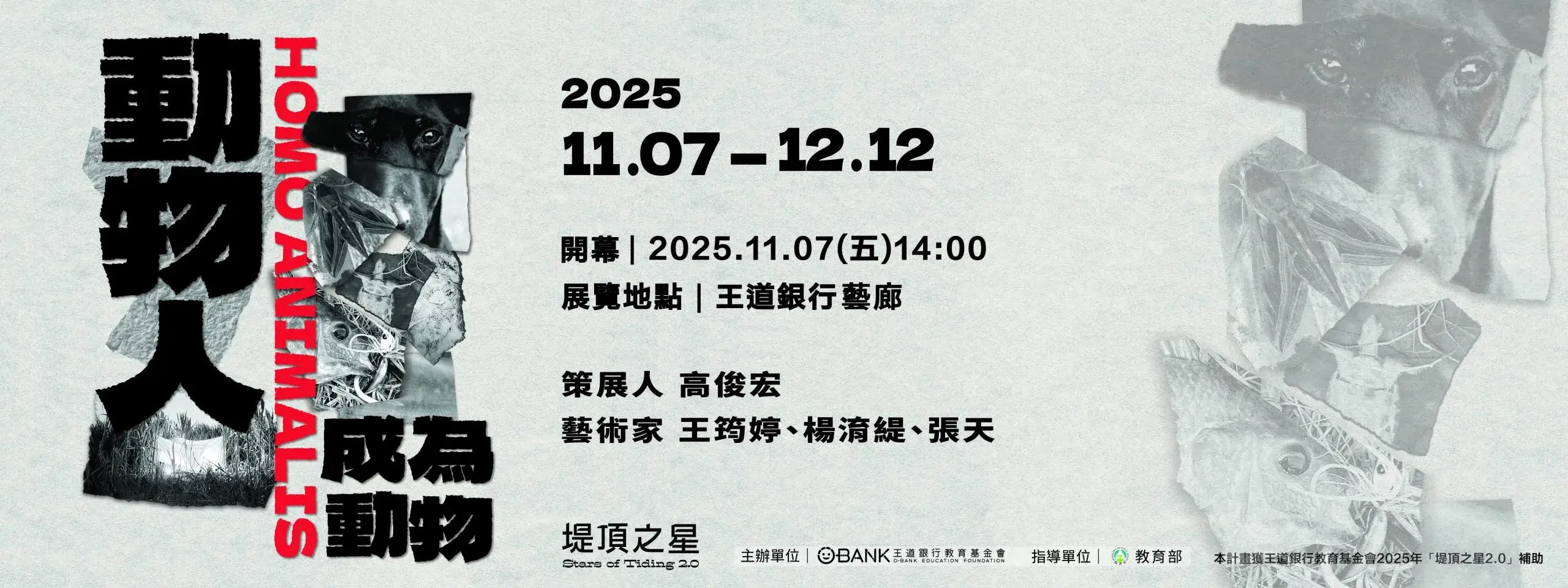 本展覽以三位創作者王筠婷、楊淯緹、張天長期的田野經驗為起點,從流浪狗、被開發排除的昆蟲、與外來魚種三個面向出發,嘗試在人的視角與動物的世界之間,打開對話的縫隙。