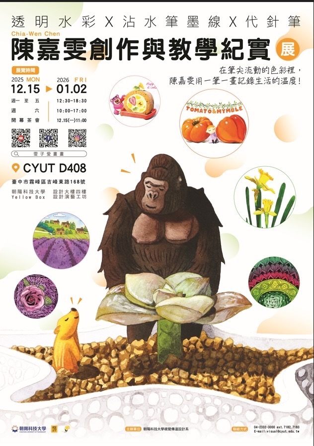 由朝陽科技大學視覺傳達設計系主辦的《陳嘉雯創作與教學紀實展》將於 2025 年 12 月 15 日 正式展出,匯集陳嘉雯老師的手繪作品,並同步呈現其教學與實作歷程,以創作與教育交織的方式,帶領觀眾走進她的藝術世界。