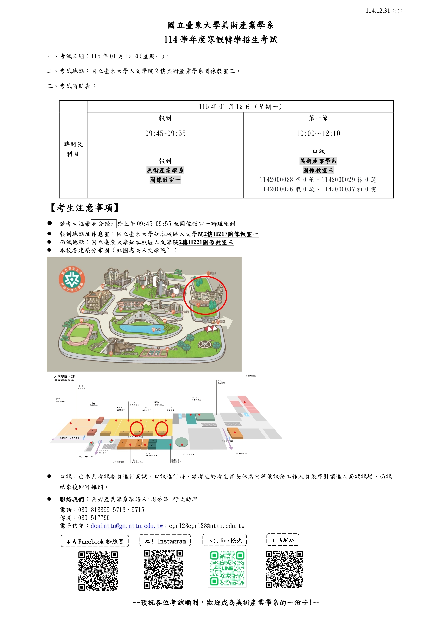 【美術產業學系】114學年度寒假轉學考 - 面試公告