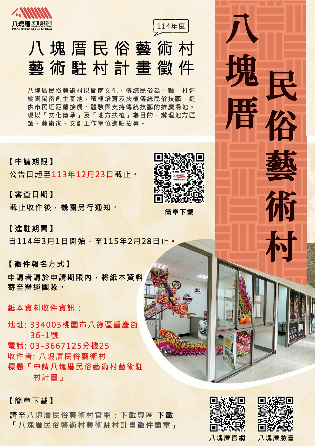 ❷ 申請前請詳閱 桃園市政府文化局「八塊厝民俗藝術村藝術駐村計畫徵件簡章」 。